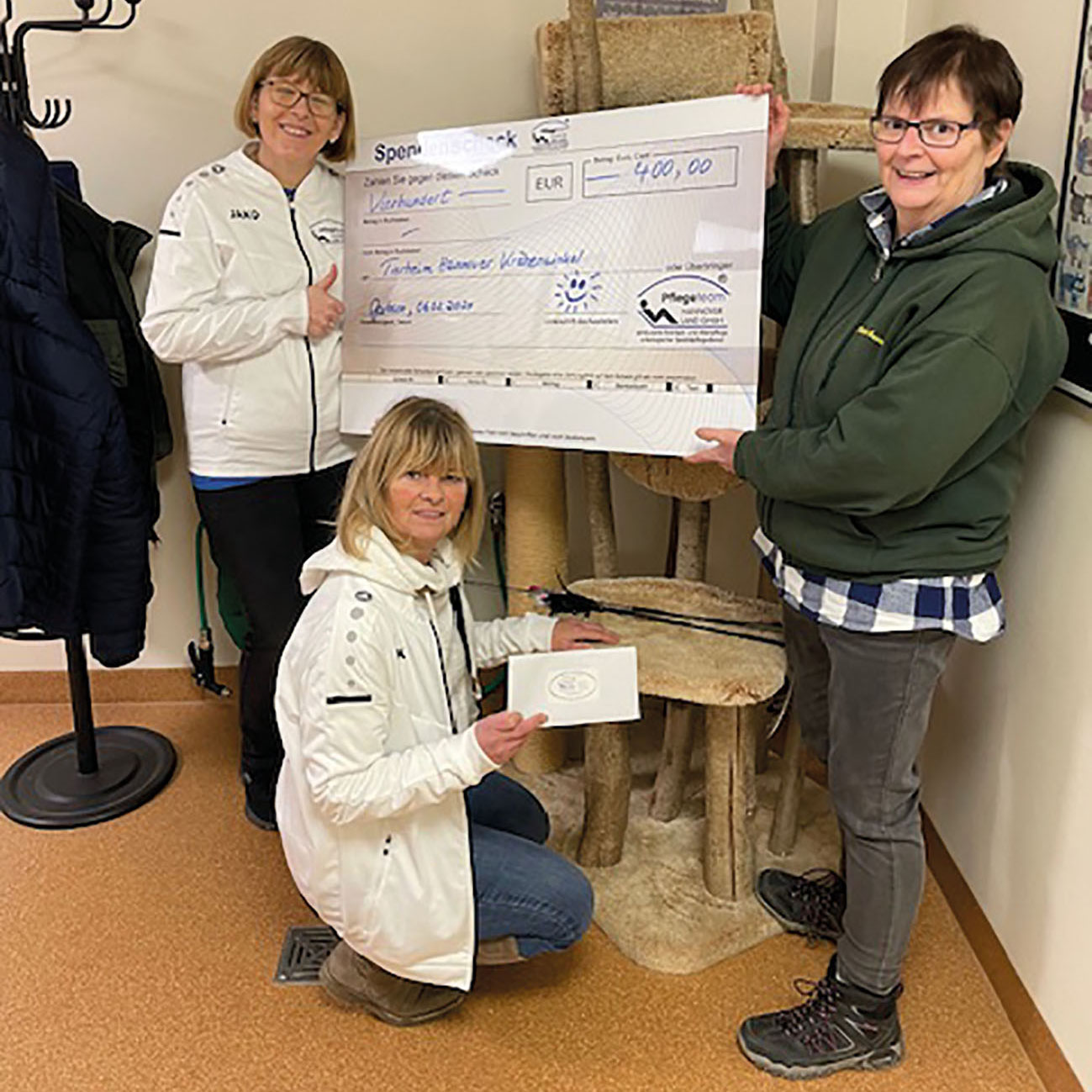 Die Mitarbeiterinnen und Mitarbeiter vom Pflegeteam Hannover Land waren von der Führung durch das Tierheim Hannover ausserordentlich beeindruckt. Eine solch moderne Einrichtung vorzufinden, haben sie nicht erwartet. An unsere Tierheimleiterin, Frau Doris Peterek, überreichten Sie im Anschluss 400 Euro.